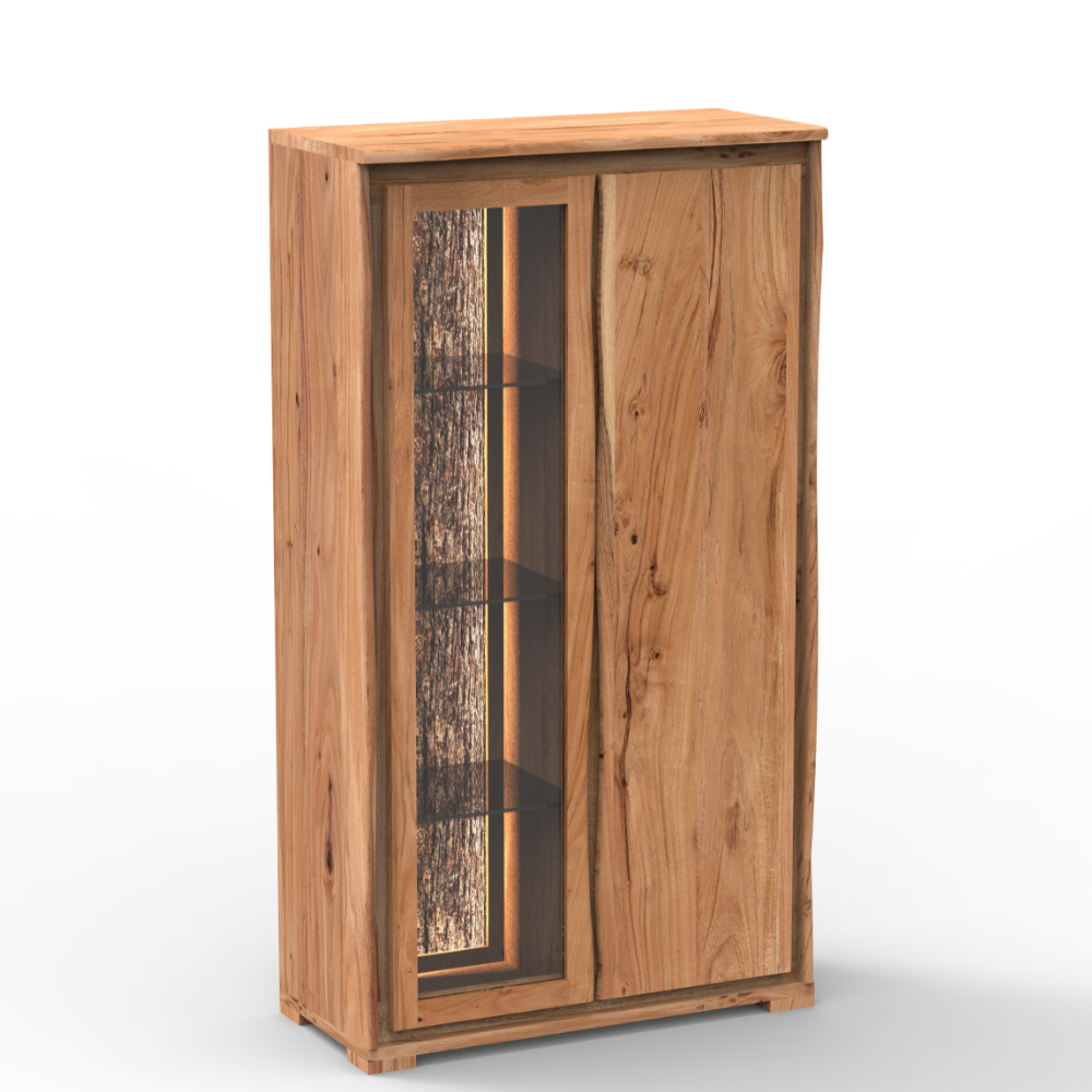 This live edge wooden cabinet combines modern design with rustic elegance. Crafted from solid wood, it highlights natural grain patterns and a unique live edge finish that makes each piece one of a kind. The cabinet features a sleek glass door with interior shelving, ideal for displaying décor items, tableware, or collectibles, while offering hidden storage space on the side. Perfect for living rooms, dining spaces, or offices, this cabinet blends functionality with natural beauty.