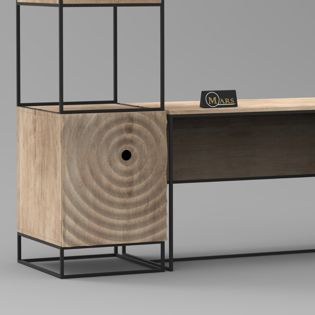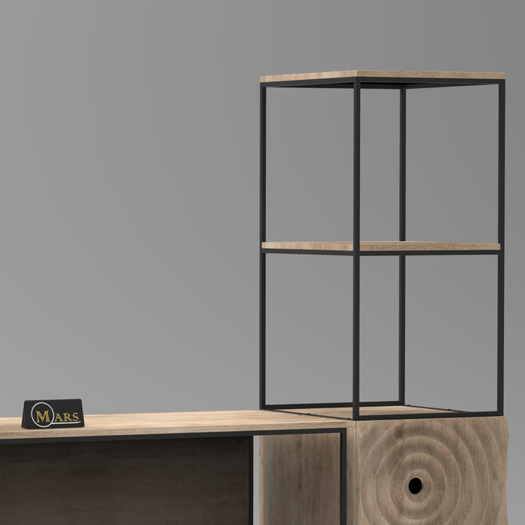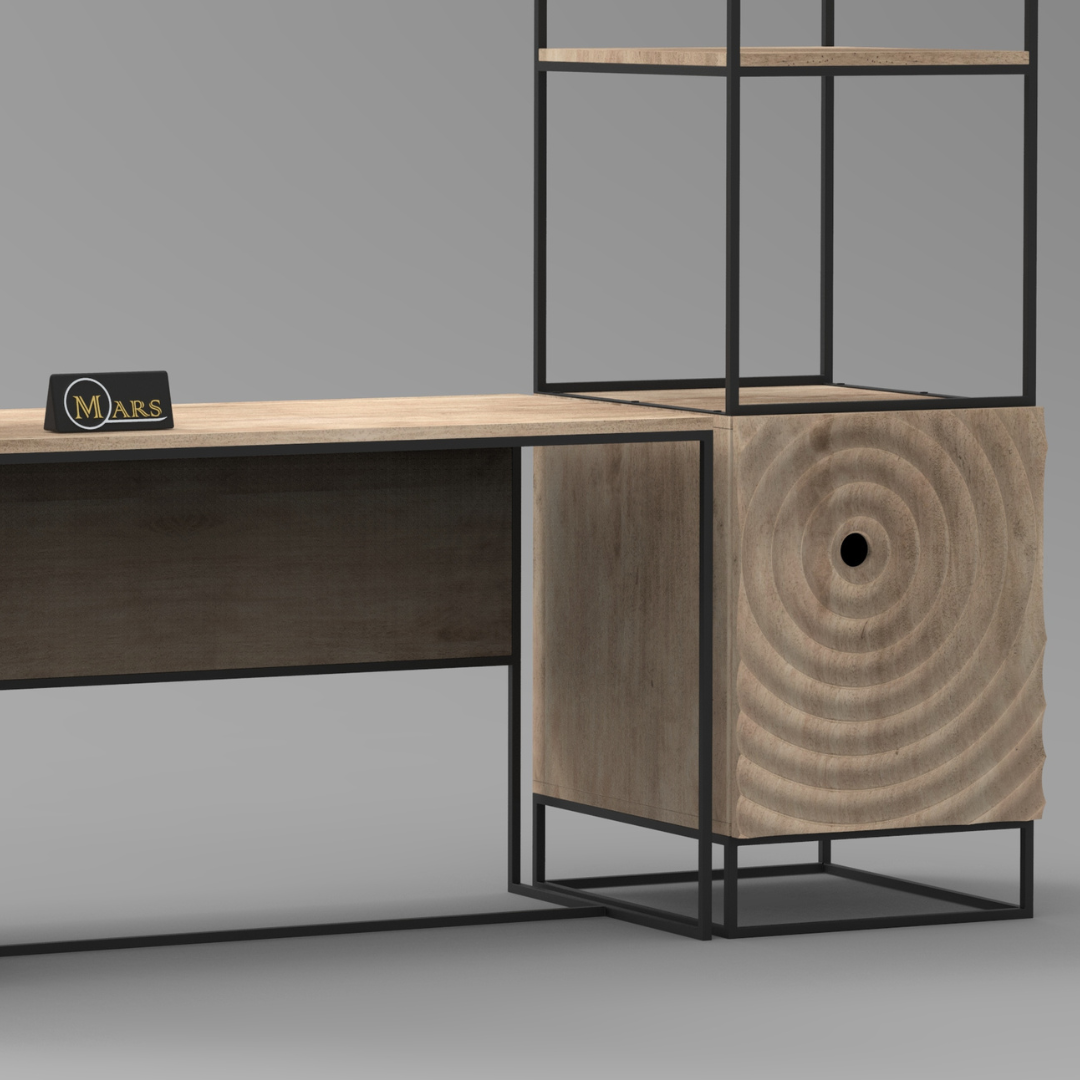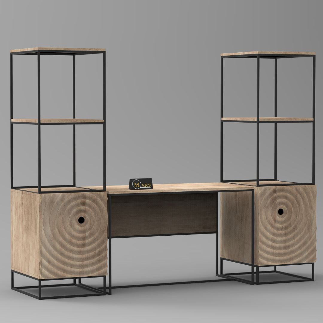 Upgrade your workspace with this modern wooden office desk, crafted with a beautiful natural wood finish and a sleek black metal frame. Designed for both functionality and style, it features open shelving units on both sides, offering ample space to display books, décor, or office essentials.