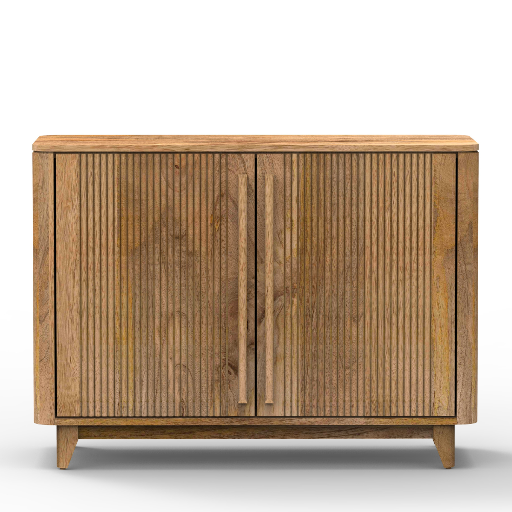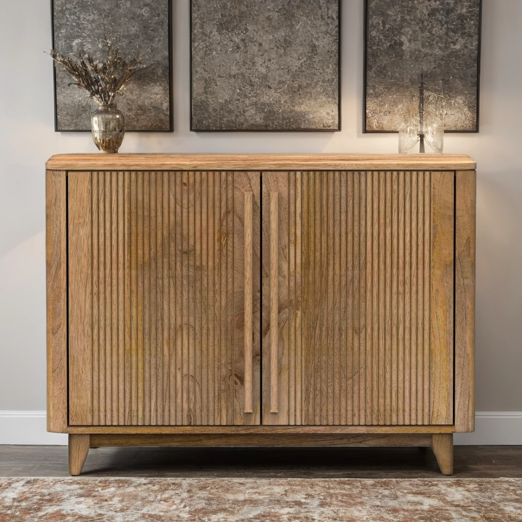 A contemporary wooden sideboard with vertical slatted doors and minimalist design, ideal for living rooms, dining areas, or hallways.