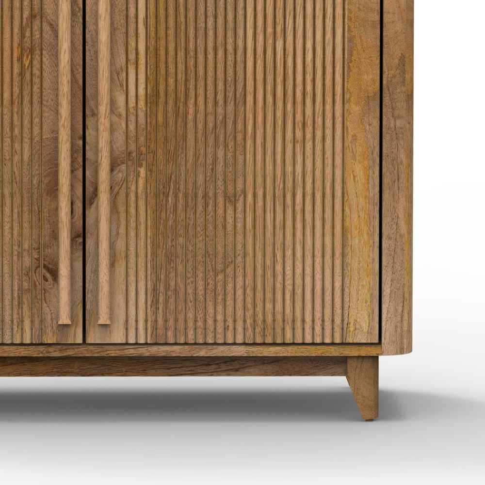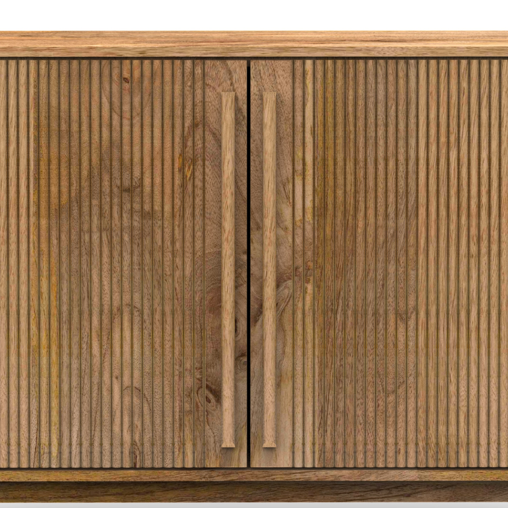 This modern wooden sideboard cabinet combines minimalist design with practical storage. Crafted from natural solid wood, it features vertical slatted doors that create a textured and elegant look, while tall handles add to its sleek and contemporary aesthetic. The cabinet rests on sturdy short legs, giving it a slightly elevated appearance and ensuring durability.