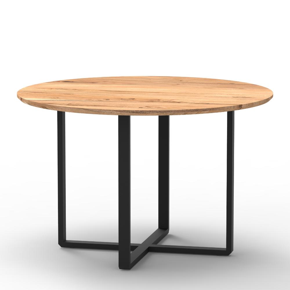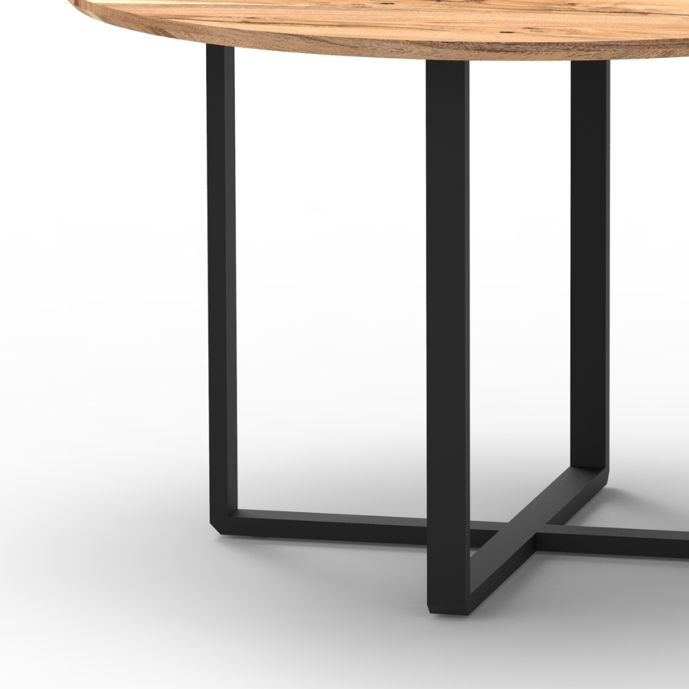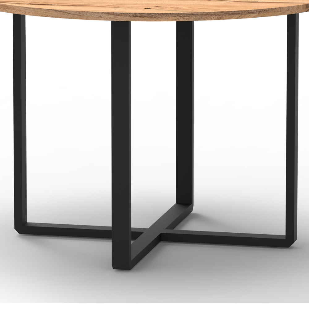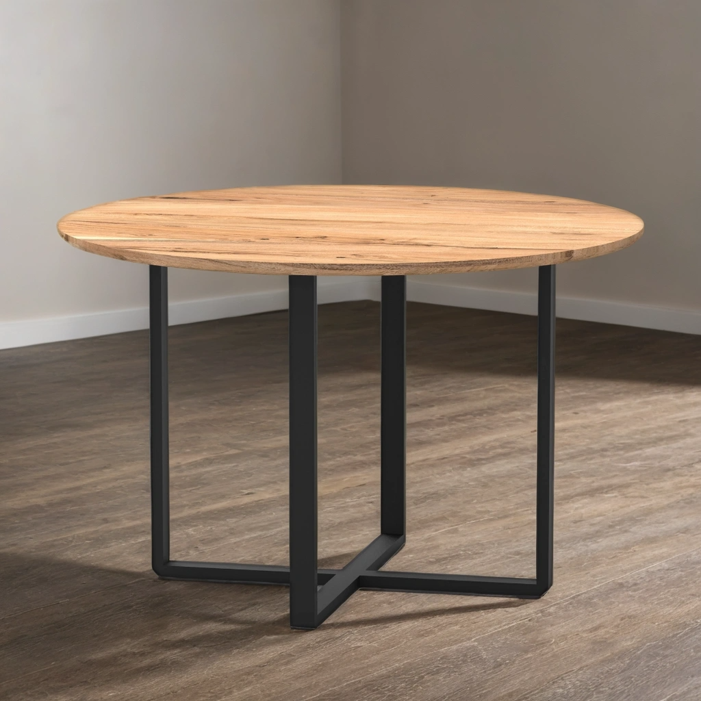 Bring a touch of modern industrial charm to your home with this round wooden dining table. Featuring a solid wooden tabletop with natural grain patterns and a sturdy black metal cross-frame base, this table combines durability with contemporary elegance.