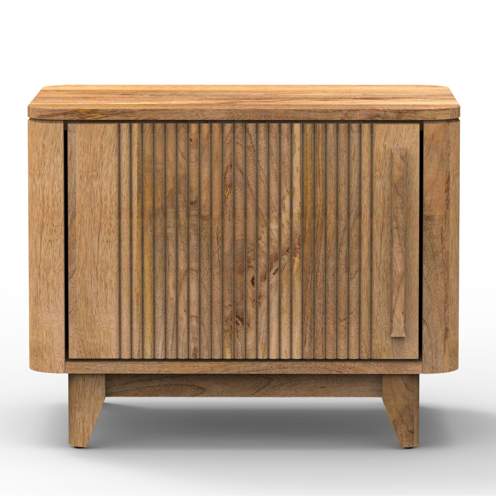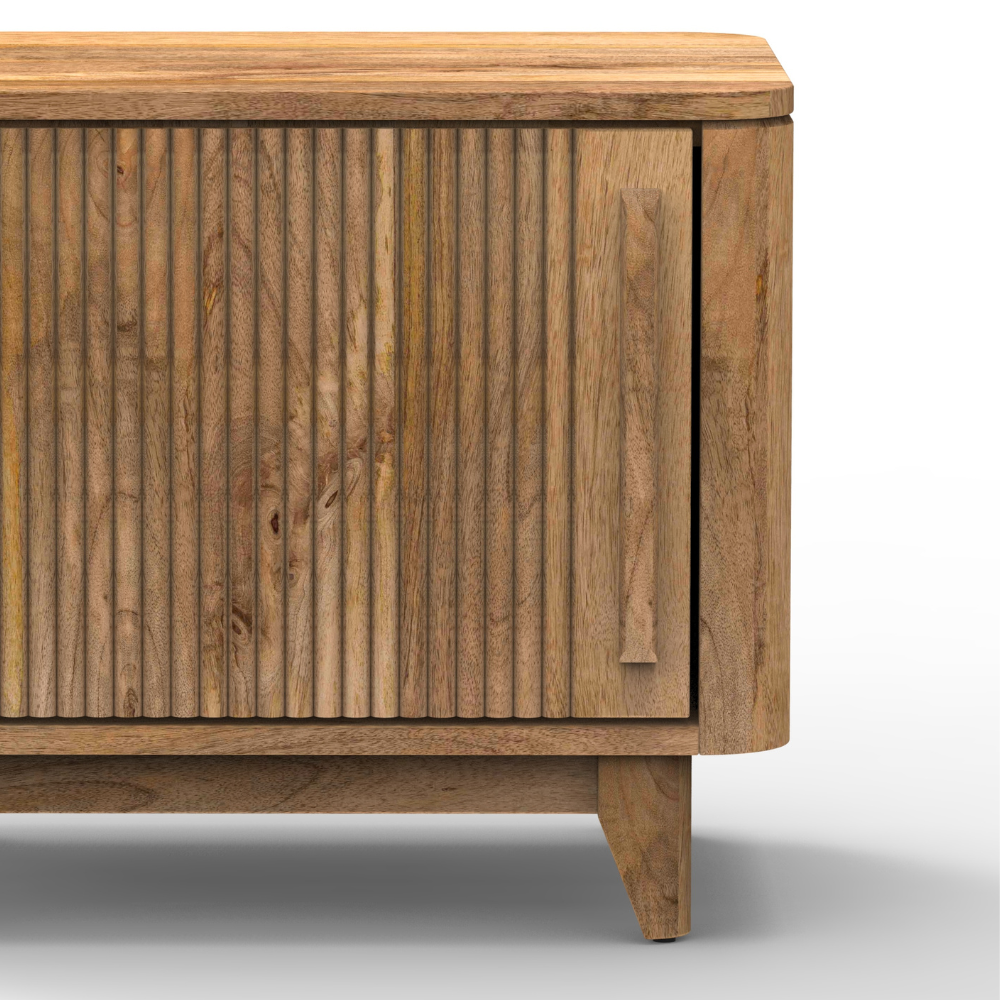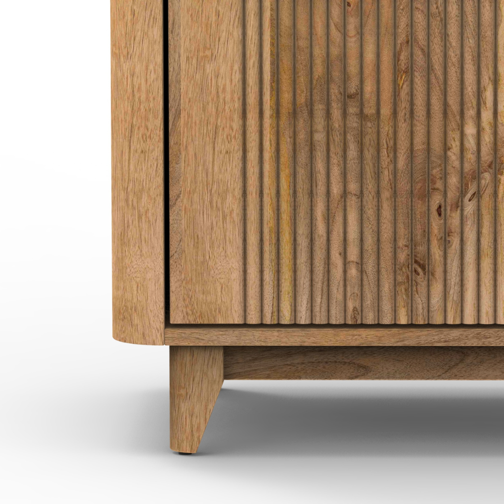 Add timeless elegance to your home with this solid wood sideboard, designed with a beautiful slatted front detail that blends modern and rustic styles. The compact yet spacious design makes it a versatile storage solution for any room, while the natural wood grain finish highlights its handcrafted charm.