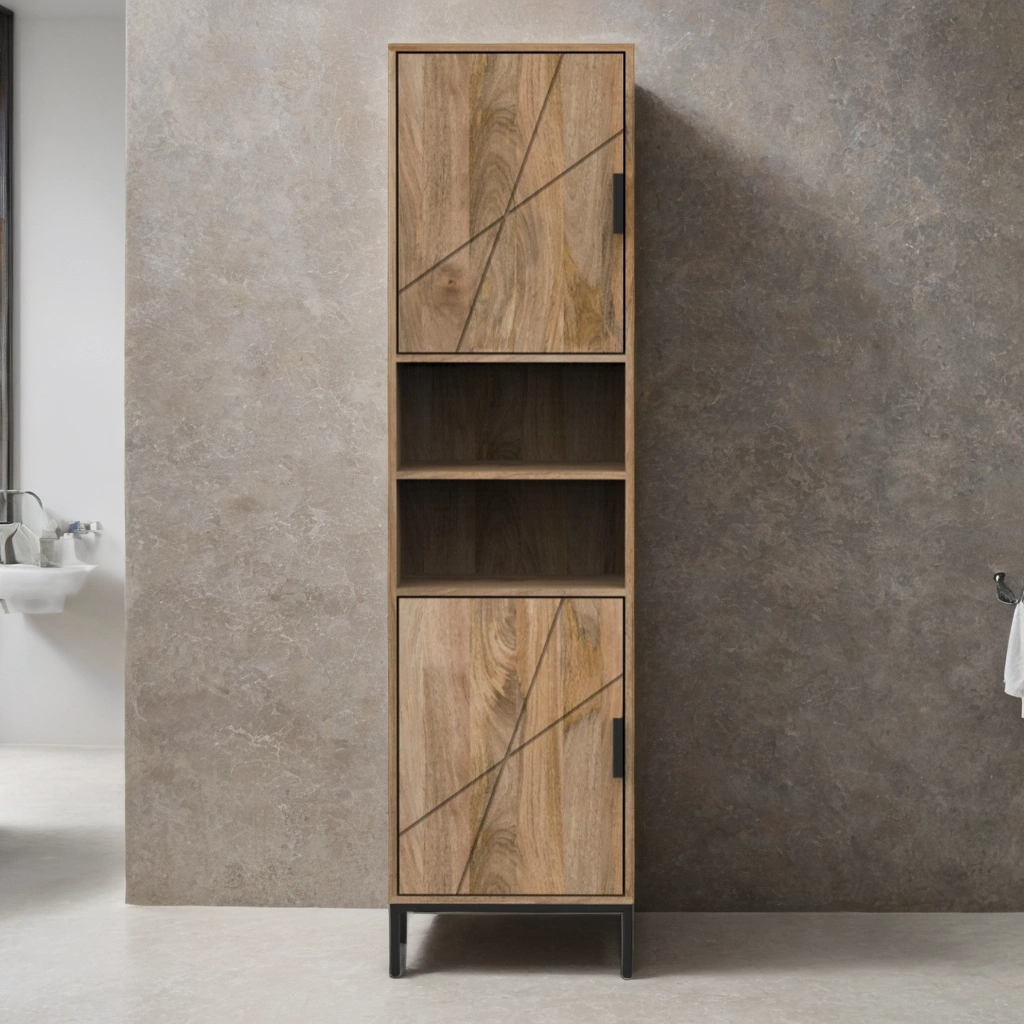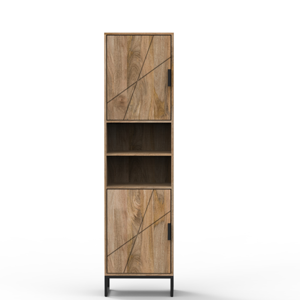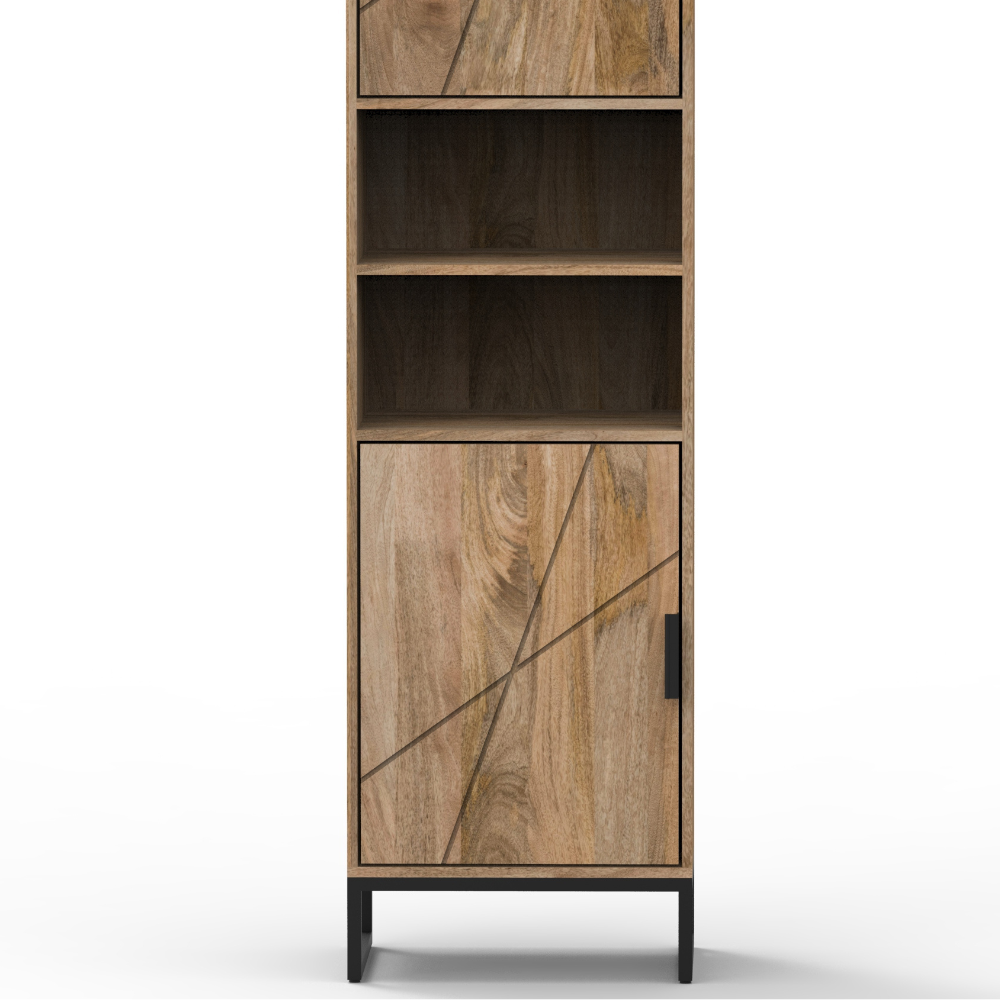 This modern wooden storage cabinet is a stylish and functional piece of furniture, designed to complement contemporary interiors. It features a tall and slim structure with two closed compartments—one at the top and one at the bottom—along with two open shelves in the center, providing a perfect balance of hidden storage and display space. The cabinet is crafted from natural wood with a beautiful grain pattern and accented with diagonal carved details on the doors, adding a unique touch of modern artistry. Its sturdy black metal legs not only ensure durability but also give it a sleek, minimalist look that fits well in living rooms, bedrooms, home offices, or hallways.